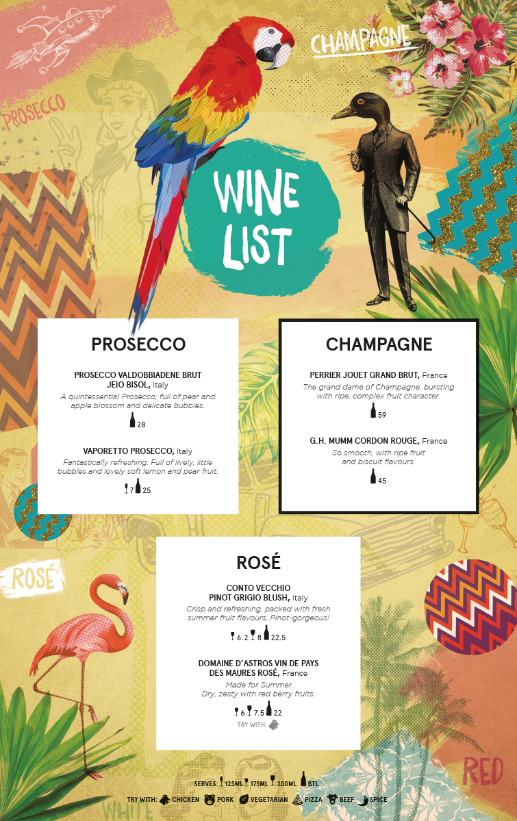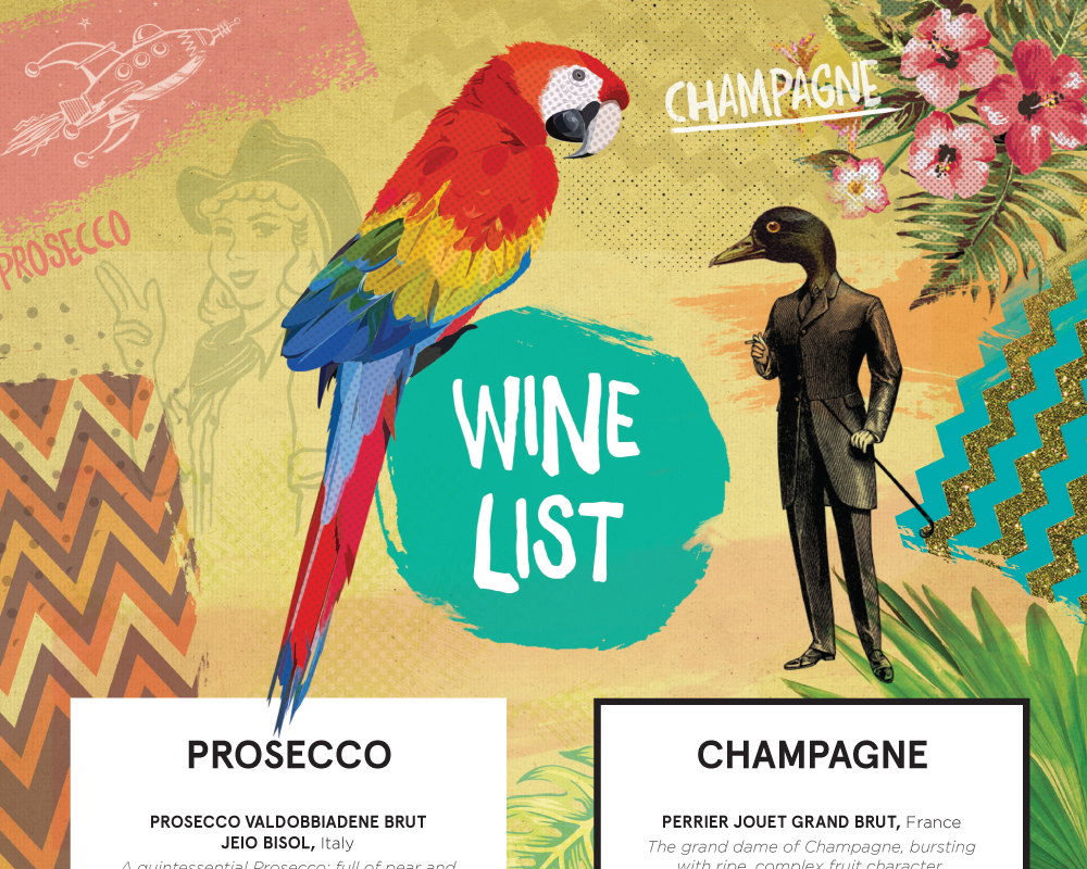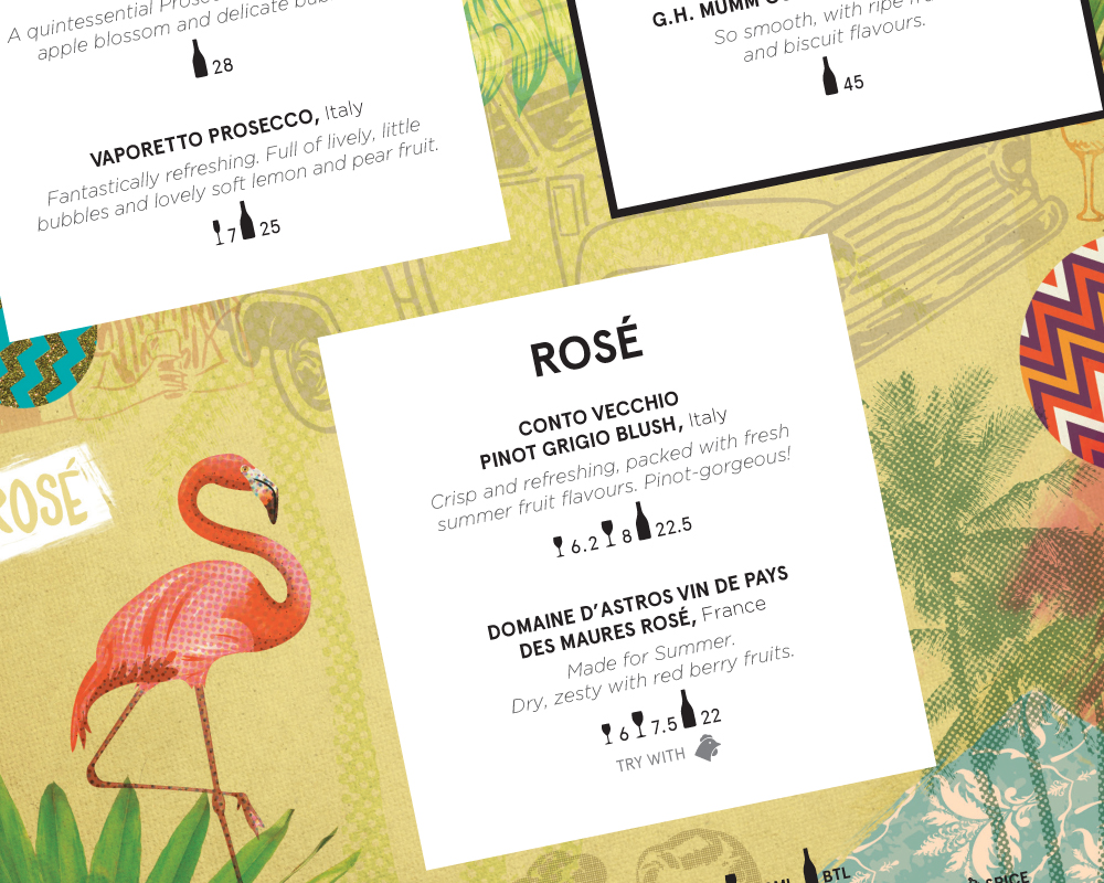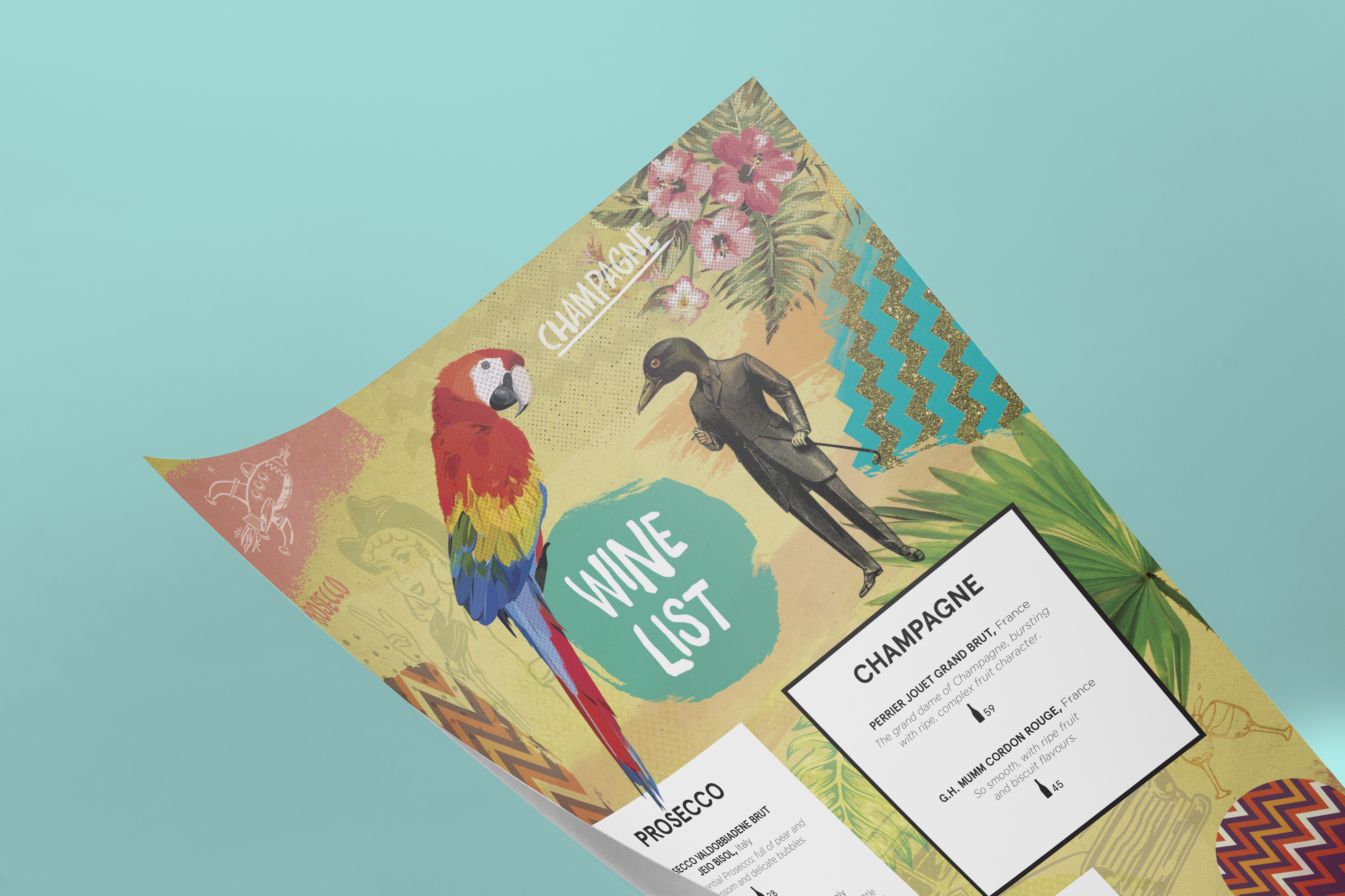 This client’s pub had undergone refurbishment with a new tropical-themed outdoor area in time for summer. Their food menu had elements of collage and illustration and was quite eclectic, so I made a wine list that would sit well alongside it but emphasise the tropical/ summer theme.