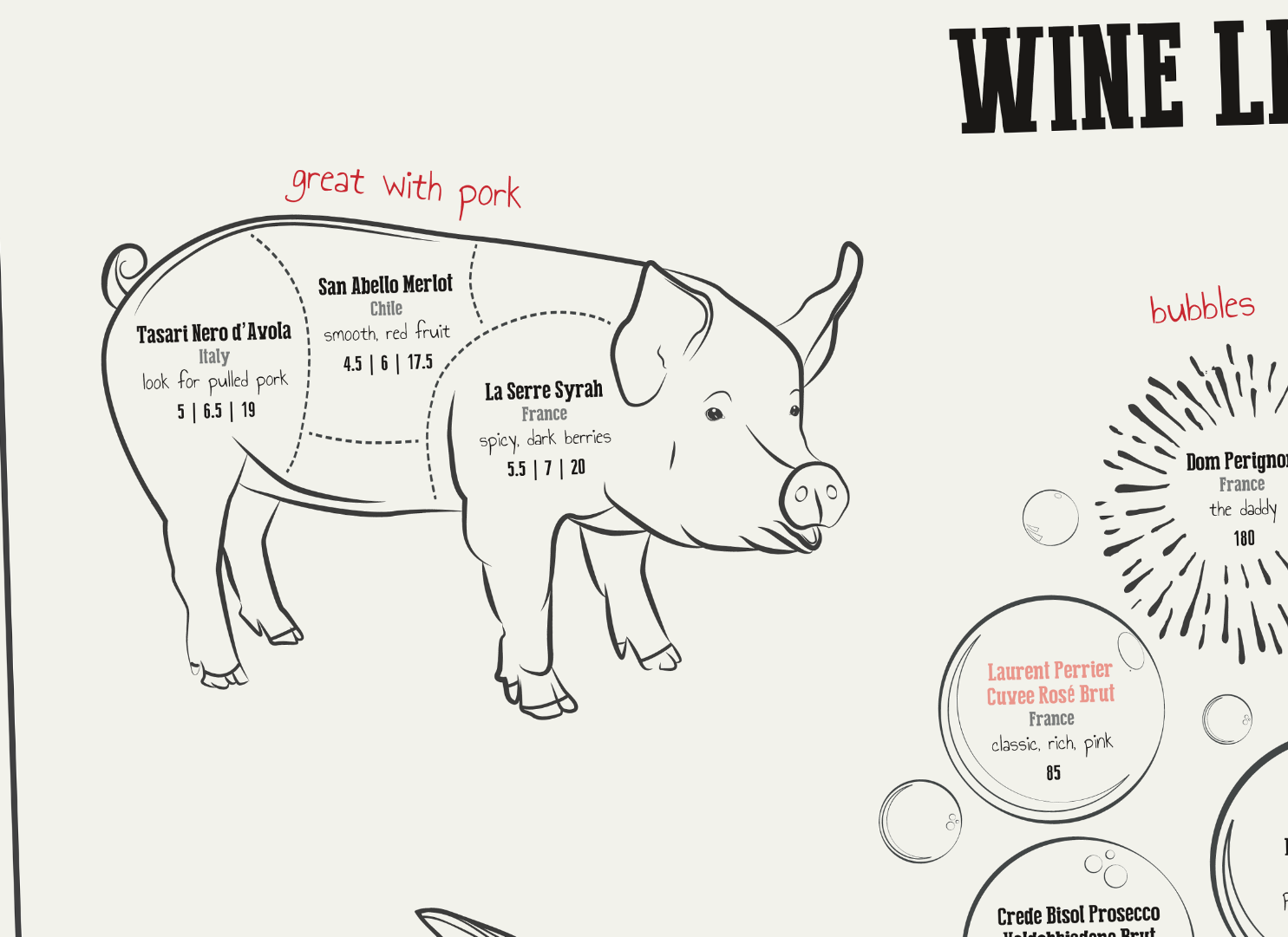 Since the restaurant was a smokehouse, this brought to my mind butchers style diagrams and I had the idea to present the wines that matched each meat on the animal in this style.